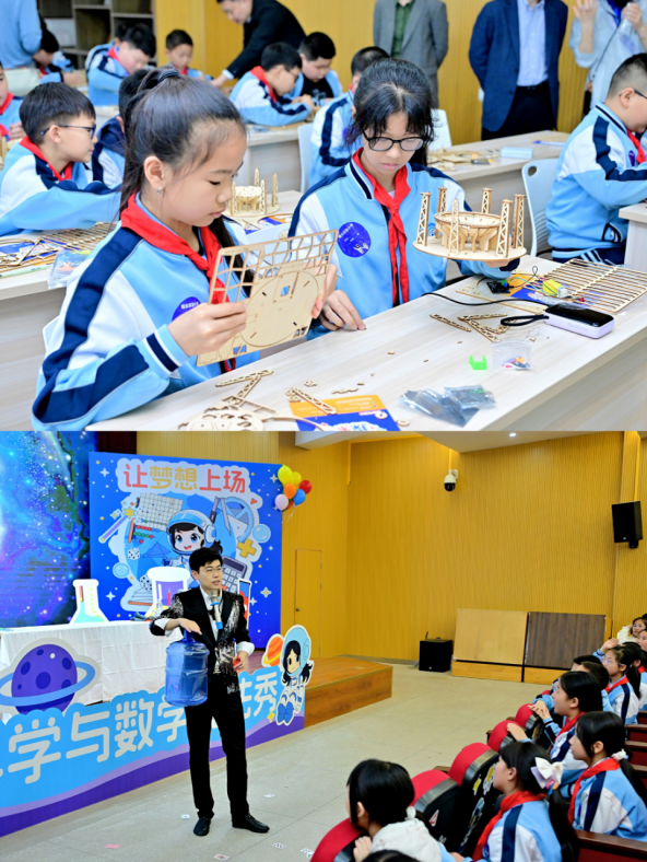 除了互动体验项目,系列特色活动同样精彩纷呈。在“科学家进校园”环节,北京航空航天大学专家亲临现场,为孩子们讲述芯片与“中国天眼”背后的科技奥秘。在这里,芯片不再是遥不可及的“AI大脑”,而是近在眼前的科技基石。同学们还化身“小工程师”,亲手搭建人工智能天眼模型,在动手操作中,让科学想象变成真实存在;在“科学与数学魔法秀”上,奇幻的实验现象轮番上演,看似不可思议的科学原理被生动解读,彻底引爆全场师生的好奇心;“名师讲堂”科学与数学趣味示范课和专家研讨环节,则为师生们提供了深度学习、交流提升的机会,助力科学教育向深度延伸。