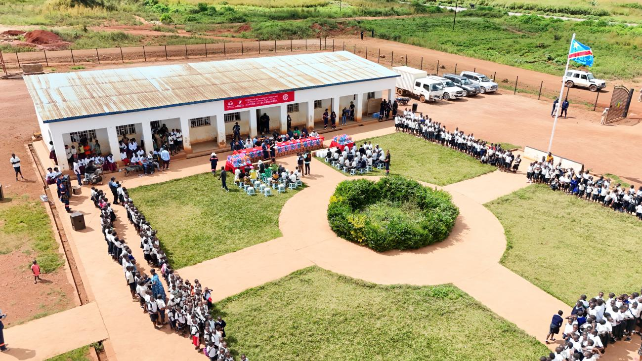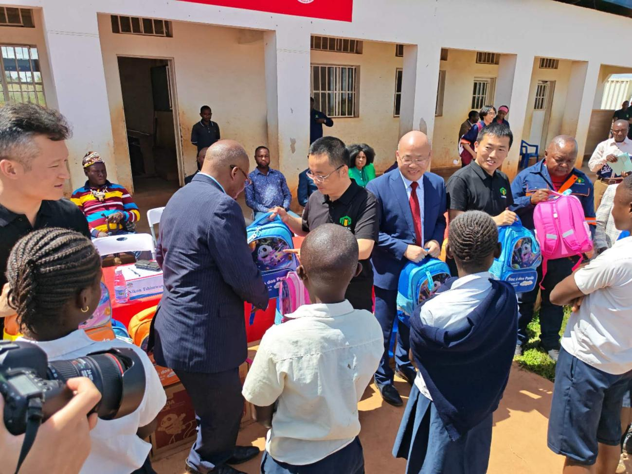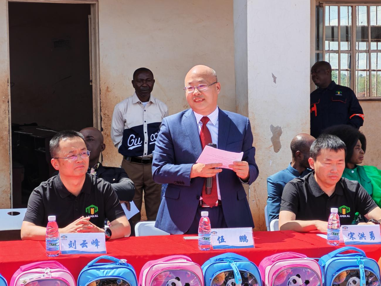 发放仪式在卡卢班巴小学学生的注视下拉开帷幕,包括刚果(金)拉米卡股份有限公司董事长刘云峰、副总经理宋洪勇,卢阿拉巴省教育厅办公室主任Nikon Tshimwang和中国乡村发展基金会国际发展部主任伍鹏等嘉宾参加。